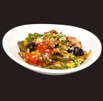 вырезка говяжья, фасоль стручковая. маслины, огурец. помидор, соус чили. соус соевый.
